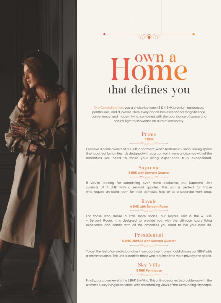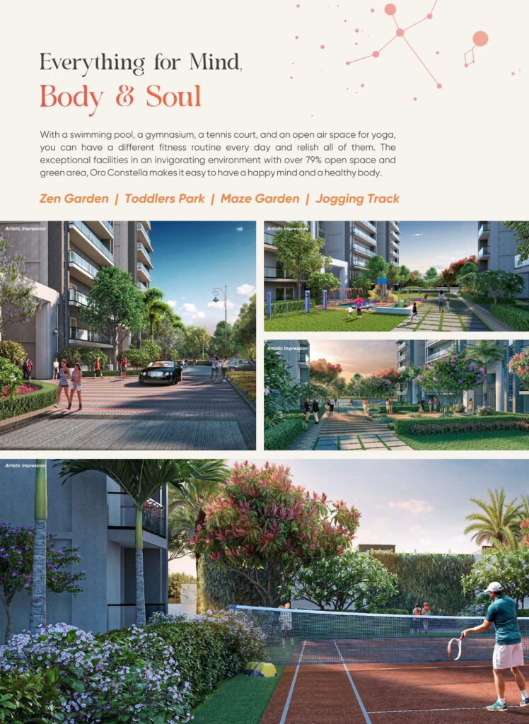 Rising tall with 4 iconic towers and thoughtfully planned 3, 4 & 5 BHK luxury residences, ORO Constella promises spacious layouts, superior finishes, and breathtaking views of lush green surroundings. Every aspect of the project reflects meticulous planning — from its contemporary façade to the landscaped open spaces that provide residents with a peaceful retreat from the hustle of the city.